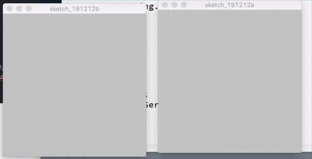 import processing.net.*; Client client; ArrayList<PVector> points; void setup() { size(300,300); client = new Client(this, "127.0.0.1", 5204); points = new ArrayList<PVector>(); } void draw() { background(0); for (int i=0; i circle(points.get(i).x, points.get(i).y, 10); } } void mouseDragged() { if (mouseButton==LEFT) { points.add(new PVector(mouseX, mouseY)); client.write(mouseX+" "+mouseY+" "+0); } else if (mouseButton==RIGHT&&points.size()>0) { points.remove(points.size()-1); client.write(mouseX+" "+mouseY+" "+1); } } |